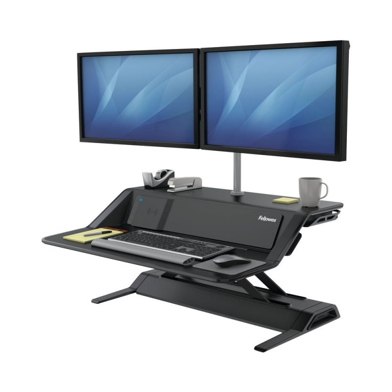 Fellowes Lotus DX Sit-Stand Workstation in Black The Fellowes Black Lotus DX Sit-Stand Workstation takes your workspace to the next level with a built in charging station featuring wireless charging capabilities to allow effortless productivity. Featuring 22 height settings this 8081001 workstation easily accommodates individual user heights and arrives fully assembled. USB ports and wireless charging support the built-in device channel to allow easy access to keep devices fully charged. Microban Protection for added protection against bacteria, mould and mildew Patent Pending Smooth Lift Technology keeps the workstation stable and allows effortless changing of positions Arrives fully assembled 22 height settings to accommodate individual user heights Cable management system allows the entire workspace to move freely with the user Available in black and white Compatible with the Lotus Single and Dual monitor arm kits